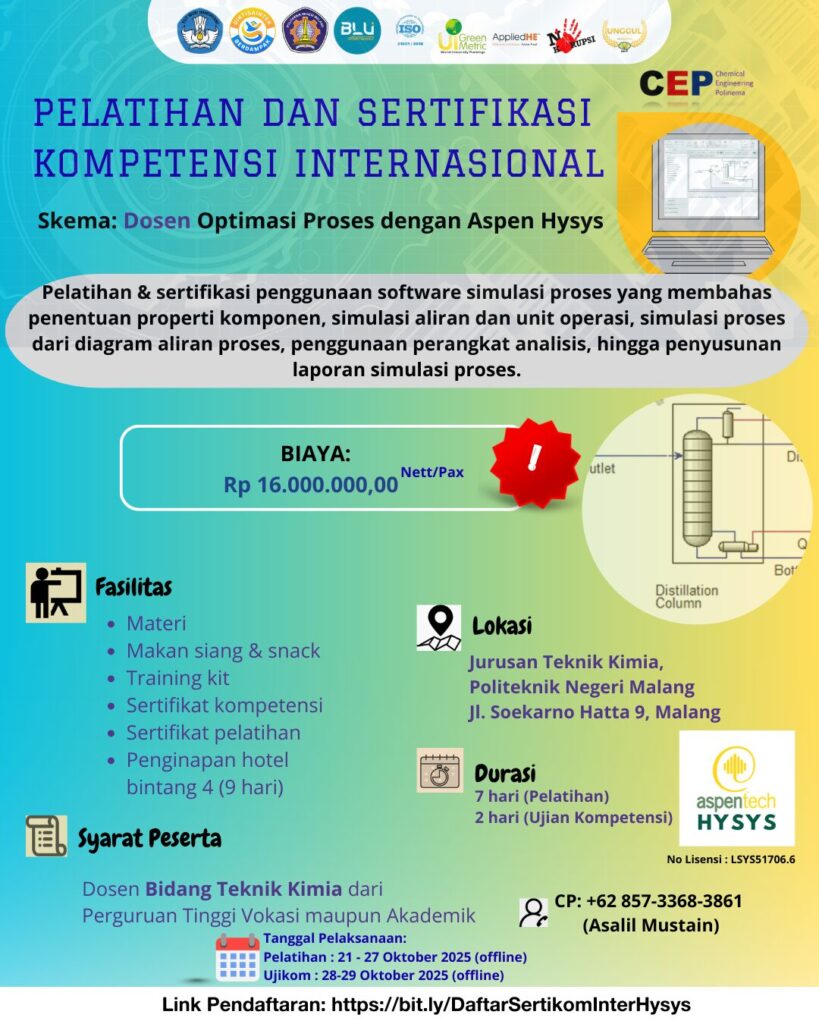 Syarat peserta: Dosen Bidang Teknik Kimia dari Perguruan Tinggi Vokasi maupun Akademik